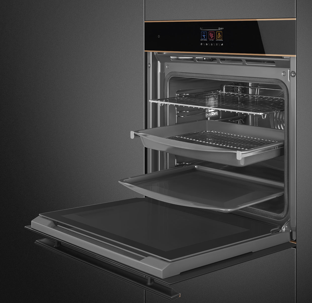 Описаниешкаф духовой электрический независимый с функцией пароварки, 60 см, черное стекло Eclipse, медный профиль