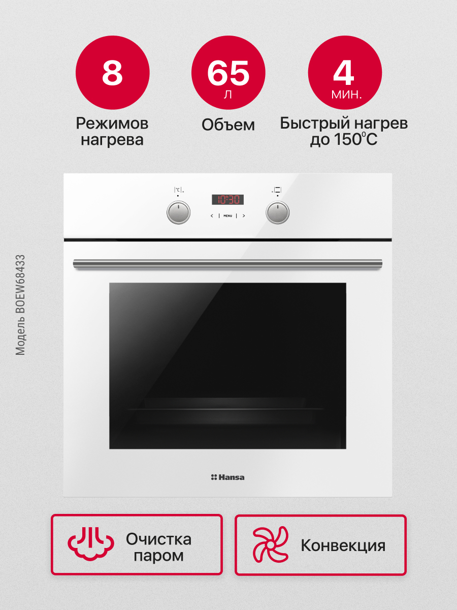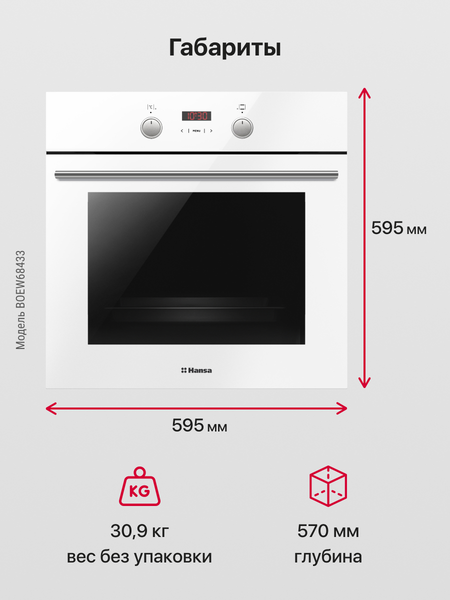 Размер (Высота) 59,5 см Размер (Глубина) 57 см Размер (Ширина) 59,5 см Цвет белый Класс энергопотребления класс A Ширина прибора 60 см Дисплей есть Конвекция есть Объём духовки 65 л Очистка духовки паром Переключатели утапливаемые Режимов работы 8 Количество стекол дверцы духовки три Тип духовки электрическая Установка независимая Телескопические направляющие нет Управление утапливаемые переключатели Таймер есть Функции нет Приготовление с помощью пара нет Термозонд (Термощуп) нет Защита от детей нет Мощность подключения, Вт 2900 Плавное закрытие дверцы духовки нет Фронтальная поверхность закалённое стекло Фурнитура нержавеющая сталь Гарантийный срок (месяцы) 12 Страна производитель Польша Ссылка на сайт производителя https://hansa.ru/product/elektricheskiy-duhovoy-shkaf-hansa-boew68433-belyy Размер в упаковке (Высота) 66 см Размер в упаковке (Ширина) 67 см Размер в упаковке (Глубина) 70 см Вес прибора 30,9 кг Размер (Ширина), см 59,5 Размер (Высота), см (Общие) 59,5 Размер (Глубина), см 57 - Отзывы