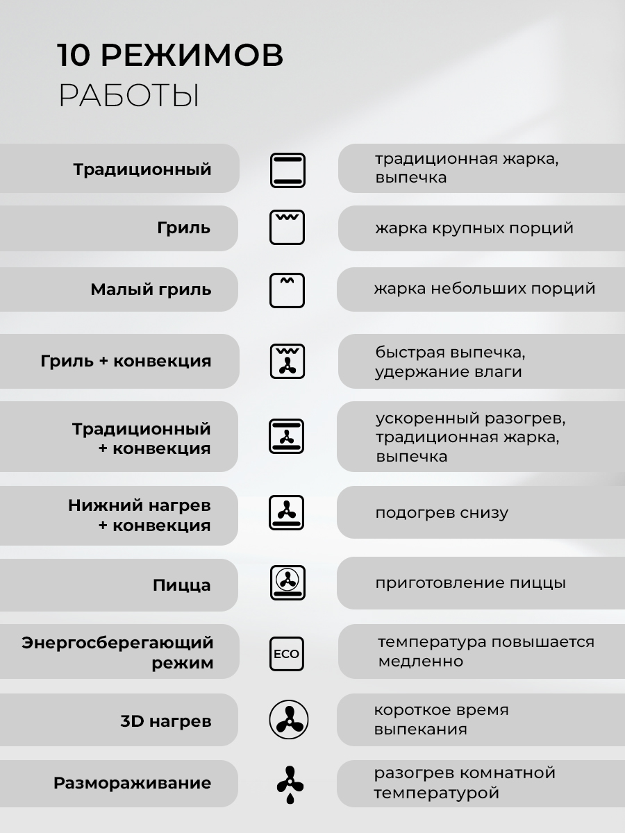 Размер (Высота) 59,5 см Размер (Глубина) 57,5 см Размер (Ширина) 59,5 см Цвет белый Класс энергопотребления класс A Ширина прибора 60 см Дисплей есть Конвекция есть Объём духовки 72 л Очистка духовки традиционная Переключатели поворотные + сенсорные Режимов работы 10 Количество стекол дверцы духовки три Тип духовки электрическая Установка независимая Телескопические направляющие есть Управление электромеханическое Таймер есть Функции нет Приготовление с помощью пара нет Мощность подключения, Вт 3250 Плавное закрытие дверцы духовки есть Фронтальная поверхность закалённое стекло Фурнитура нержавеющая сталь Гарантийный срок (месяцы) 36,6 Страна производитель Китай Ссылка на сайт производителя https://lex1.ru/shop/duxovye-shkafy/s-sensornym-upravleniem/lex-edm-1002-wh Размер в упаковке (Высота) 66,5 см Размер в упаковке (Ширина) 65,5 см Размер в упаковке (Глубина) 67,5 см Вес прибора 34 кг Размер (Ширина), см 59,5 Размер (Высота), см (Общие) 59,5 Размер (Глубина), см 57,5 - Отзывы