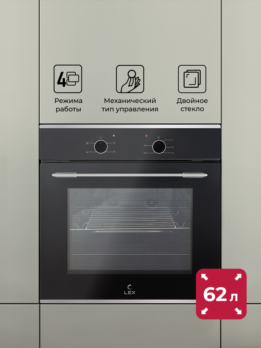 Размер (Высота) 59,5 см Размер (Глубина) 53 см Размер (Ширина) 59,5 см Цвет черный Класс энергопотребления класс A Ширина прибора 60 см Дисплей нет Конвекция нет Объём духовки 62 л Очистка духовки традиционная Переключатели поворотные Режимов работы 4 Количество стекол дверцы духовки два Тип духовки электрическая Установка независимая Телескопические направляющие нет Управление механическое Таймер нет Функции нет Приготовление с помощью пара нет Термозонд (Термощуп) нет Защита от детей нет Мощность подключения, Вт 2200 Плавное закрытие дверцы духовки нет Фронтальная поверхность закалённое стекло Фурнитура черная Гарантийный срок (месяцы) 36,6 Страна производитель Китай Ссылка на сайт производителя https://lex1.ru/shop/duxovye-shkafy/4-funktsii/lex-edm-045-bl Размер в упаковке (Высота) 66,5 см Размер в упаковке (Ширина) 65 см Размер в упаковке (Глубина) 58 см Вес прибора 25 кг Размер (Ширина), см 59,5 Размер (Высота), см (Общие) 59,5 Размер (Глубина), см 53 - Отзывы