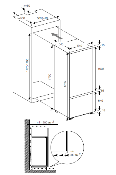 Описаниехолодильник-морозильник встраиваемый, 248 л, класс энергопотребления А+, No Frost, 54х54х177 см, белый