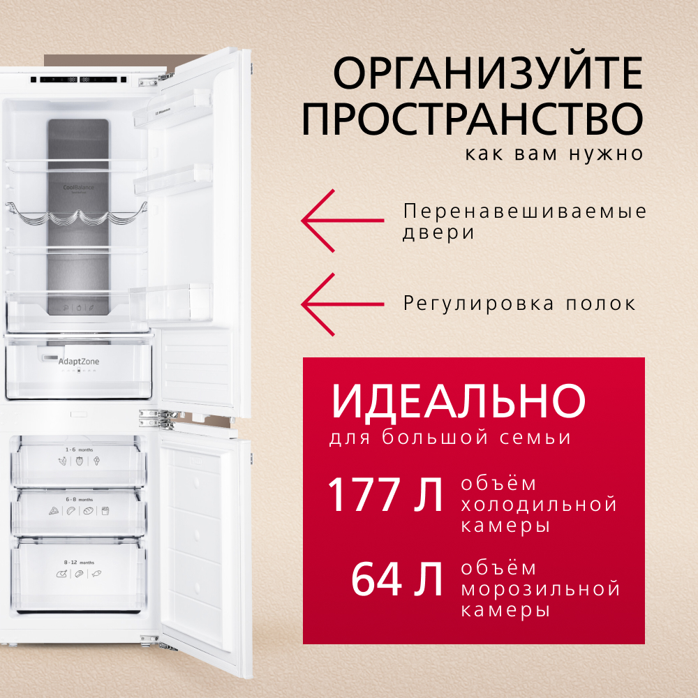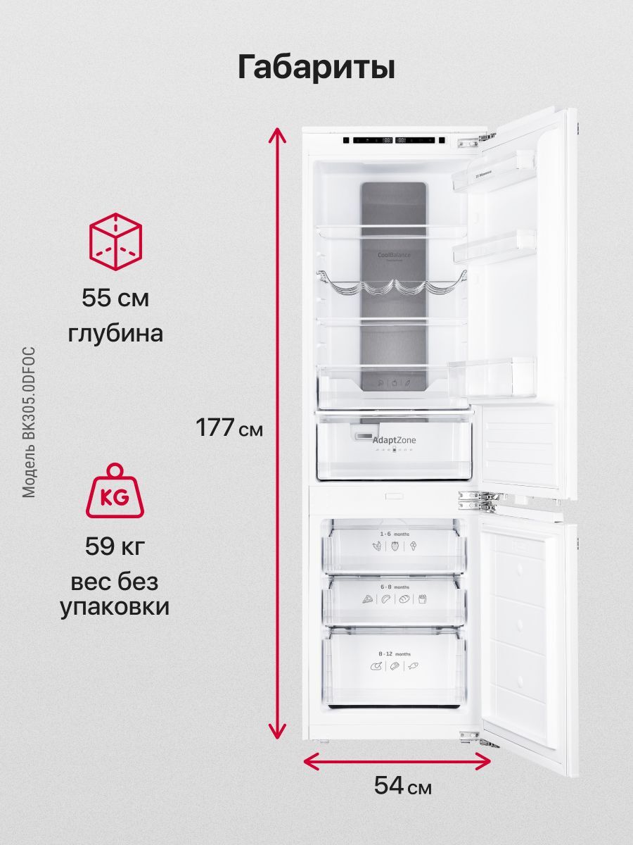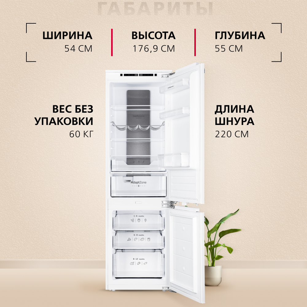 Описаниехолодильник-морозильник встраиваемый, 241 л, класс энергопотребления А+, No Frost, 54x54x178 см, белый