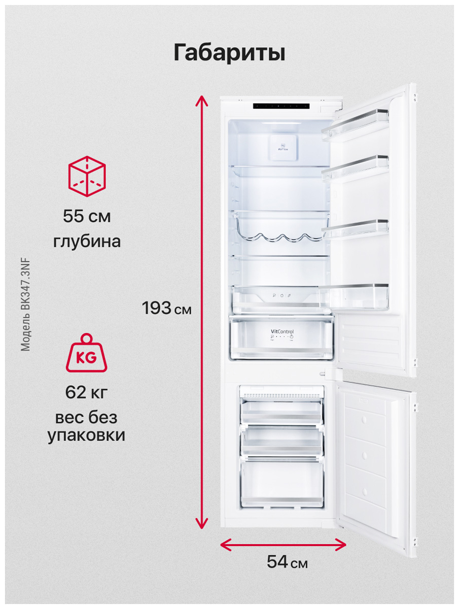 Описаниехолодильник-морозильник встраиваемый, 281 л, класс энергопотребления А+, NoFrost, 54x54x193,7 см, белый