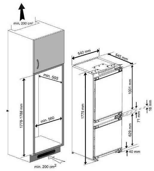Описаниехолодильник-морозильник встраиваемый, 262 л, класс энергопотребления А+, No Frost, 54х54,5х177 см