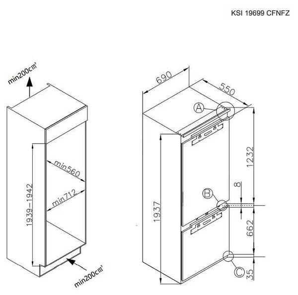 Описаниехолодильник-морозильник встраиваемый, 341 л, класс энергопотребления А+, No Frost, 55х69x193,7 cм