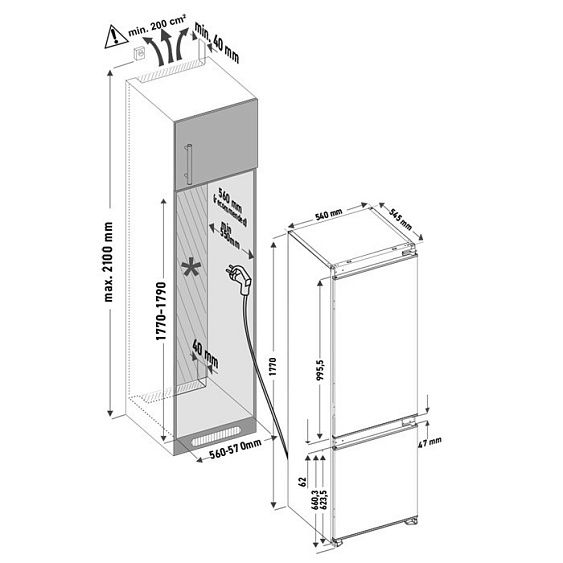 Описаниехолодильник-морозильник встраиваемый, 243 л, класс энергопотребления А+, No Frost, 54х54,5х177 см