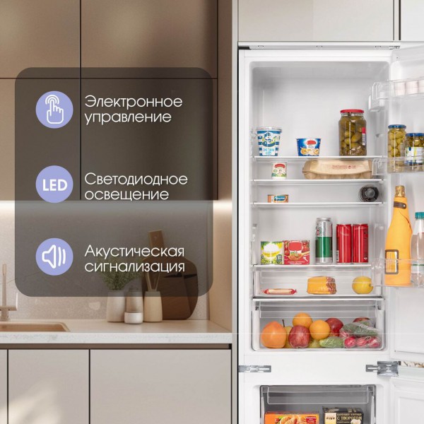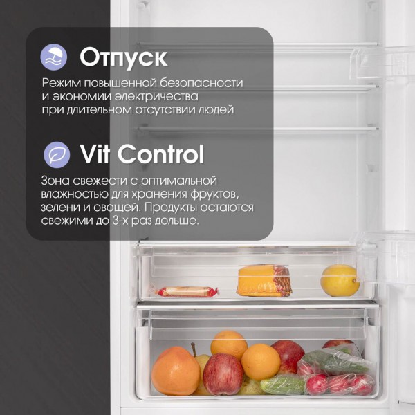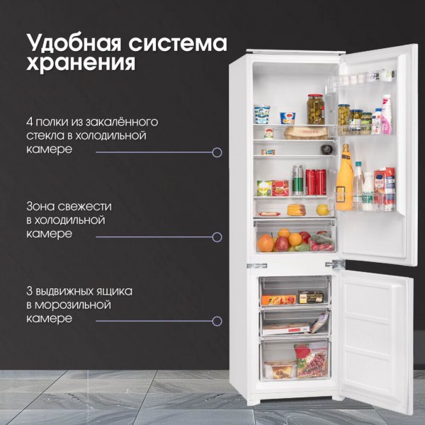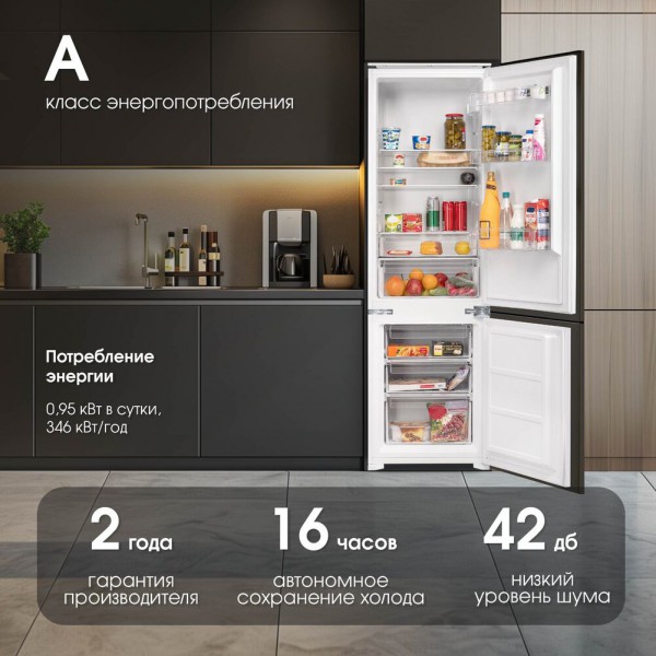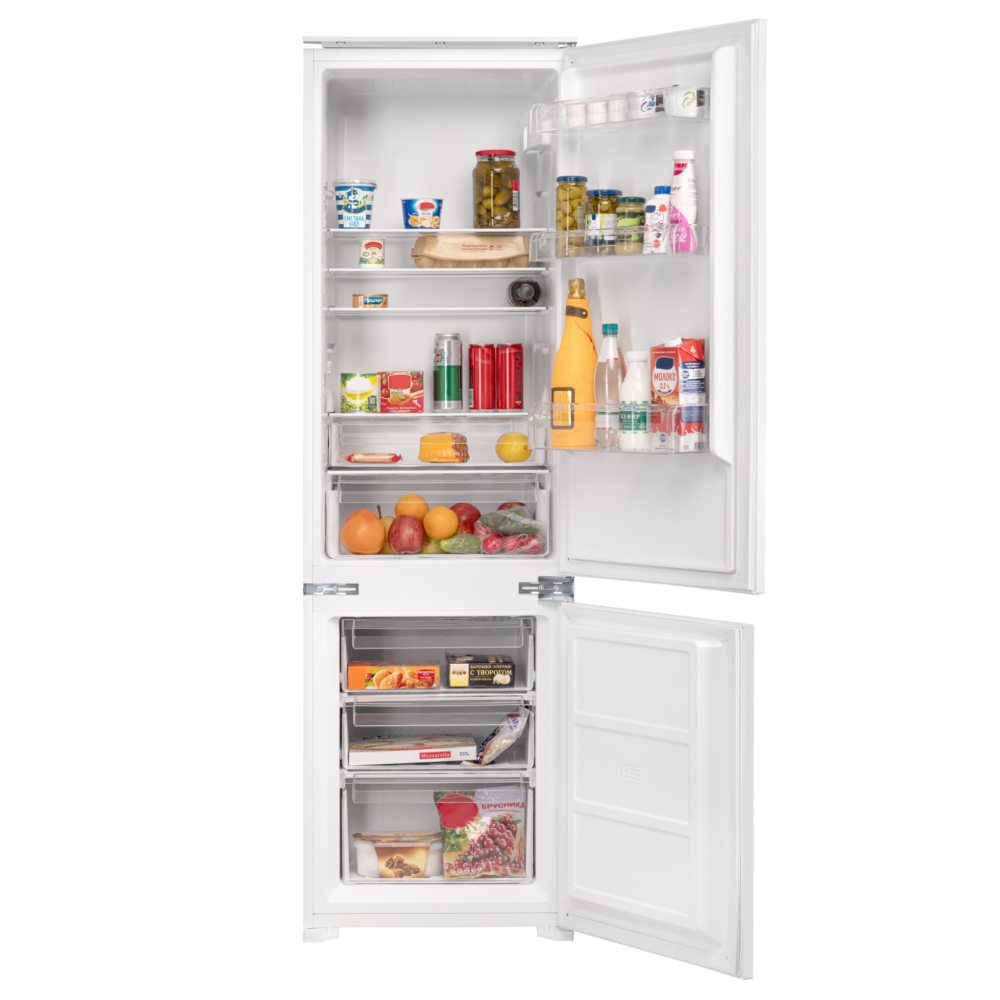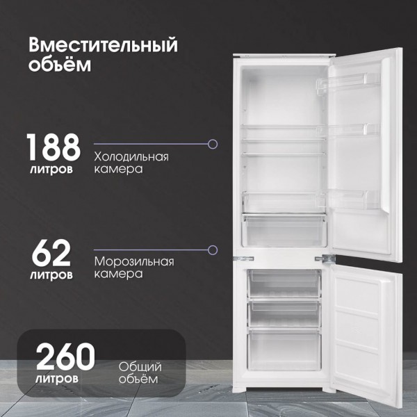 Описаниехолодильник-морозильник встраиваемый, 250 л, класс энергопотребления А+, капельная система размораживания, 54х54х178,5 см