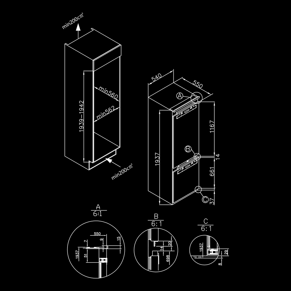 Описаниехолодильник-морозильник встраиваемый, 293 л, класс энергопотребления А+, No Frost, 54х54х193,7 см