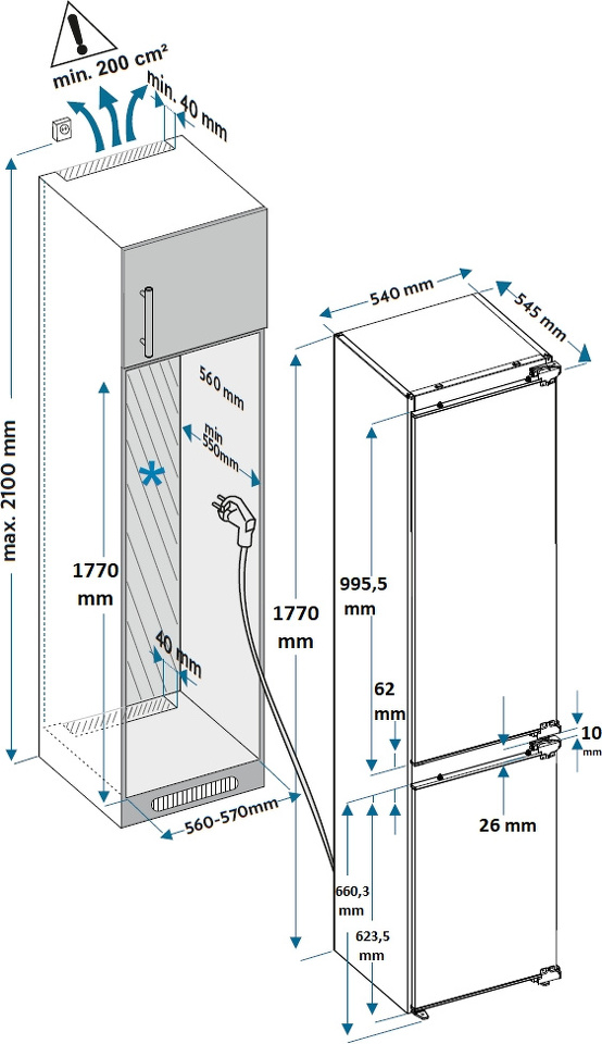 Описаниехолодильник-морозильник встраиваемый, 251 л, класс энергопотребления А+, ручная система размораживания, 54х54,5х177,2 см