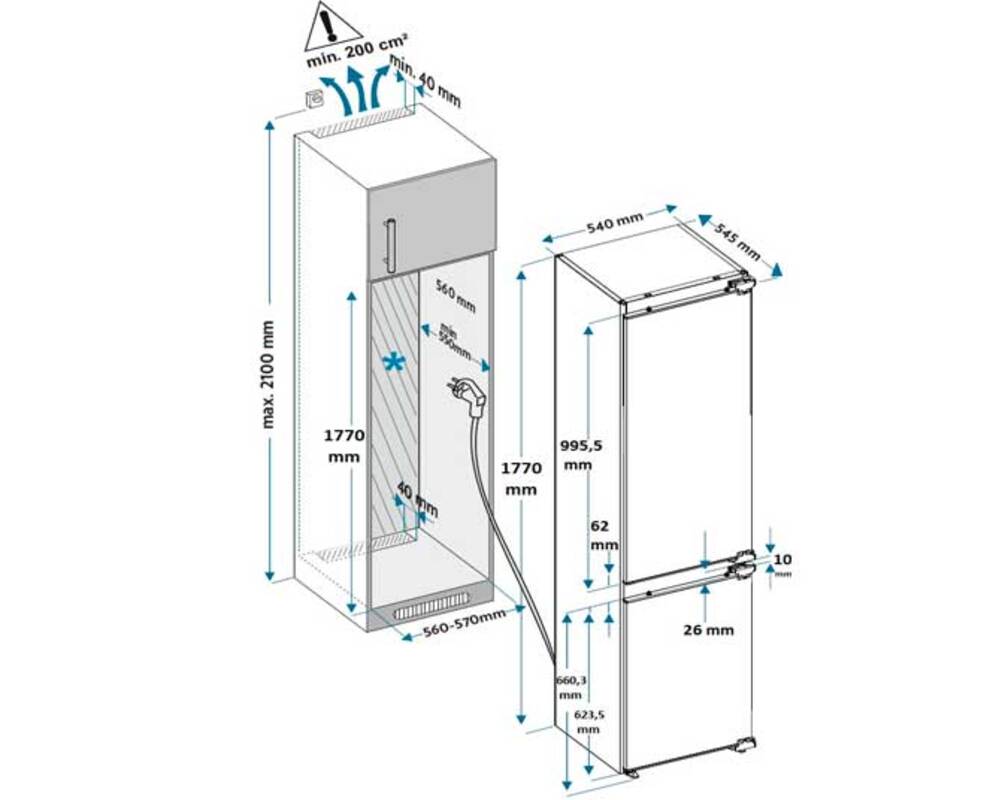 Описаниехолодильник-морозильник встраиваемый, 243 л, класс энергопотребления А+, No Frost, 54х54,5х177 см