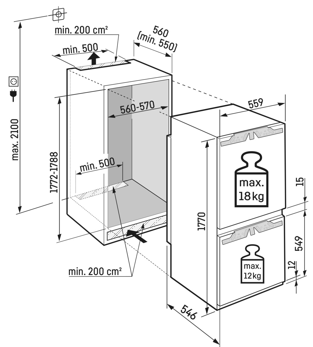 Описаниехолодильник-морозильник встраиваемый, 255 л, класс энергопотребления C, ручная система размораживания, 55,9х54,6х177 см