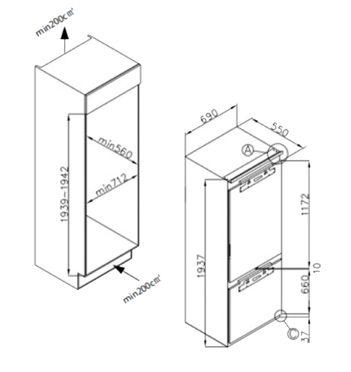 Описаниехолодильник-морозильник встраиваемый, 341 л, класс энергопотребления А+, No Frost, 69х55х193,7 см