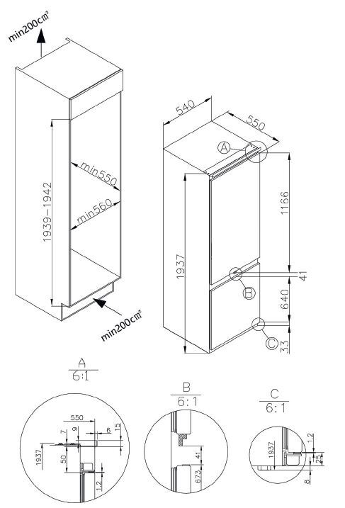 Описаниехолодильник-морозильник встраиваемый, 267 л, класс энергопотребления А+, No Frost, 54х55,5х193,7 см