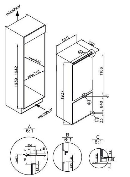 Описаниехолодильник-морозильник встраиваемый, 341 л, класс энергопотребления А+, No Frost, 69х55,5х193,7 см