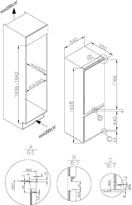 Описаниехолодильник-морозильник встраиваемый, 273 л, класс энергопотребления А+, No Frost, 54х55х193,7 см