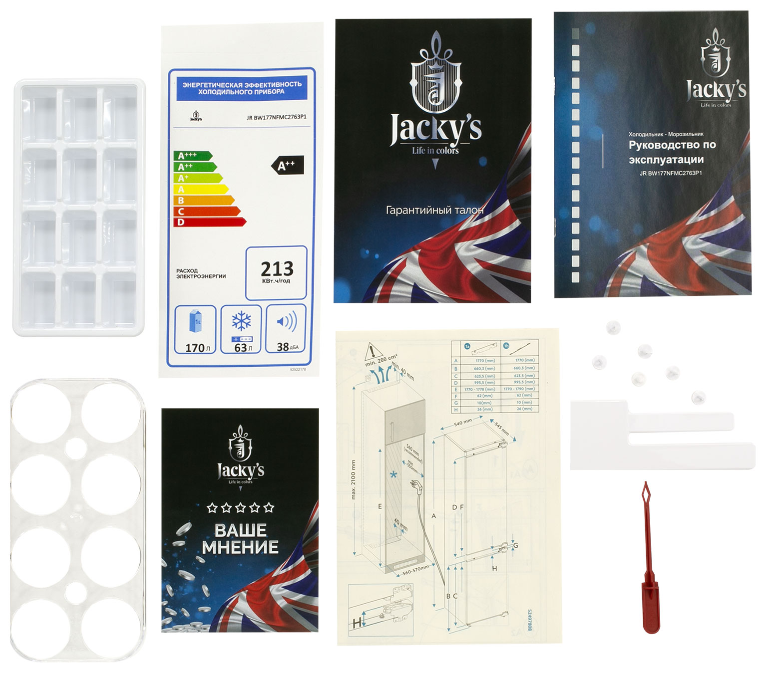 Количество дверей 2 Количество камер 2 Общий объем 233 л Объем морозильной камеры 63 л Размер (Высота) 177 см Размер (Глубина) 54,5 см Размер (Ширина) 54 см Размораживание морозильной камеры No Frost Тип установки встраиваемый Класс энергопотребления класс A++ Ширина прибора 51 - 60 см Высота прибора 176 - 180 см Управление электронное Гарантийный срок (месяцы) 36 Страна производитель Турция Ссылка на сайт производителя https://jackys.com.ru/product/jacky-s-JR-BW177NFM/#props Тип холодильник с морозильником Внутреннее освещение есть Объем холодильной камеры 170 л Размораживание холодильной камеры No Frost Расположение морозильной камеры снизу Размер в упаковке (Высота) 184 см Размер в упаковке (Ширина) 59 см Размер в упаковке (Глубина) 58 см Вес прибора 59 кг Размер (Ширина), см 54 Размер (Высота), см (Общие) 177 Размер (Глубина), см 54,5 - Отзывы
