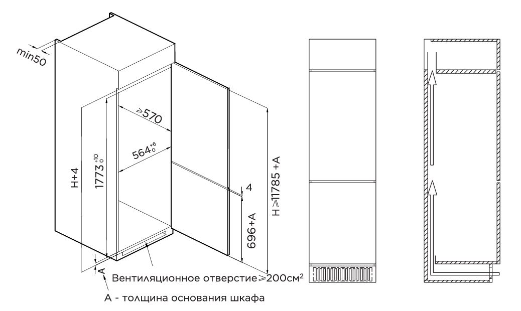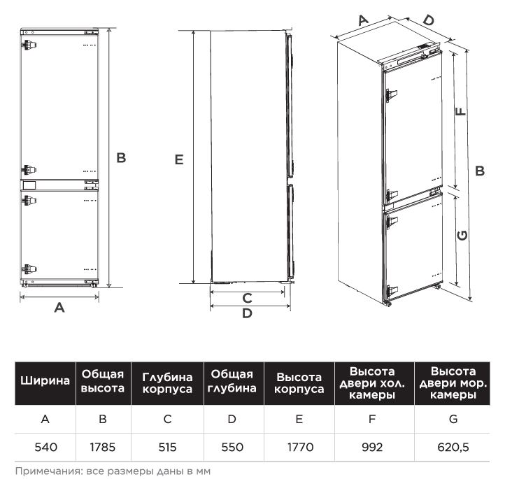 Описаниехолодильник-морозильник встраиваемый, 274 л, класс энергопотребления А++, No Frost, 54х55х178,5 см