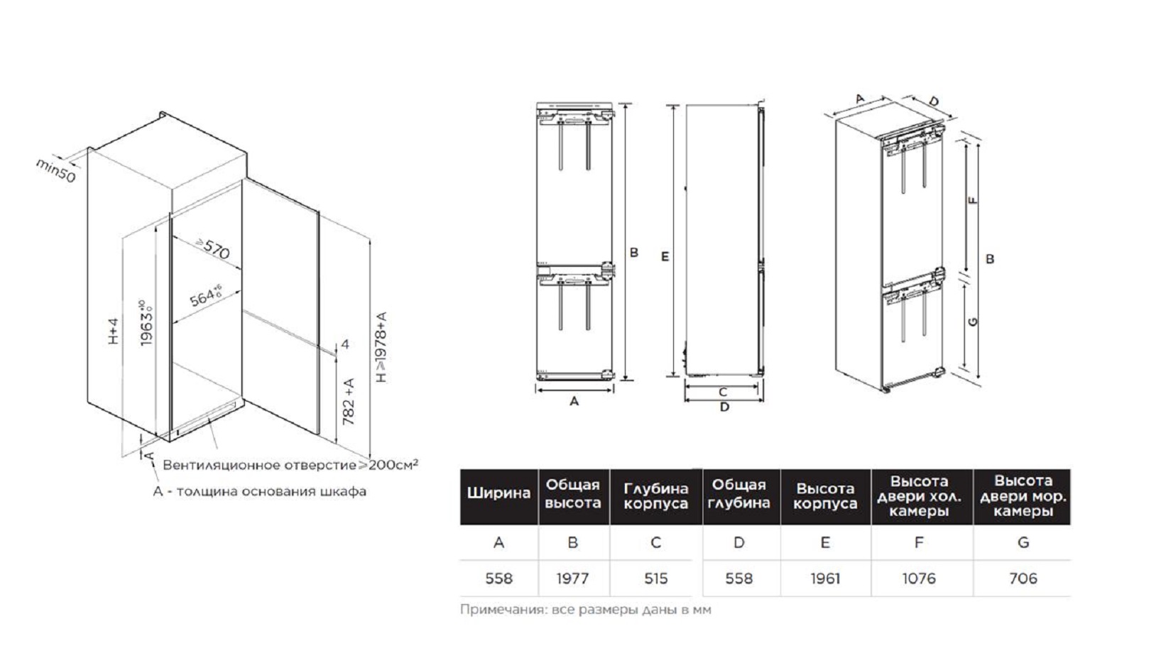 Описаниехолодильник-морозильник встраиваемый, 307 л, класс энергопотребления А++, No Frost, 55,8х55,8х197,7 см