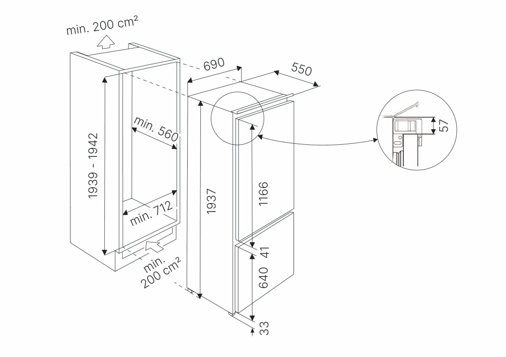 Описаниехолодильник-морозильник встраиваемый, 341 л, No Frost, 69х55х193,7 см