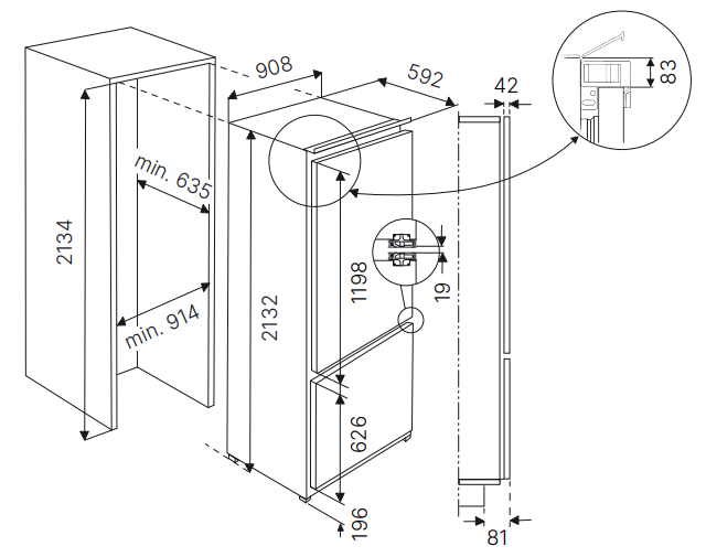 Описаниехолодильник-морозильник встраиваемый, 556 л, класс энергопотребления Е, No Frost, 90,8х59,2х213,2 см