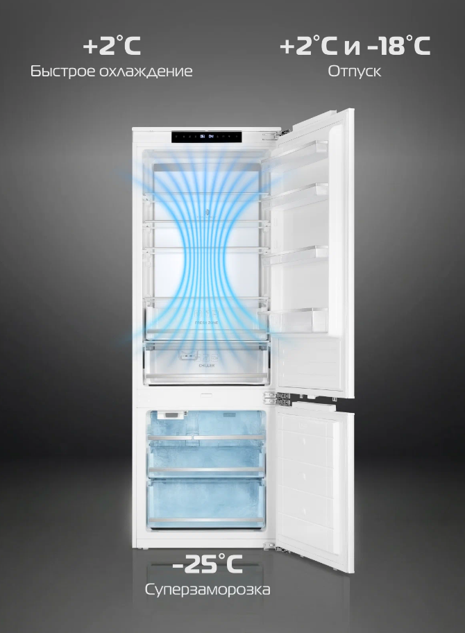 Описаниехолодильник-морозильник встраиваемый, 343 л, класс энергопотребления А+, No Frost, 69х55х193,7 см
