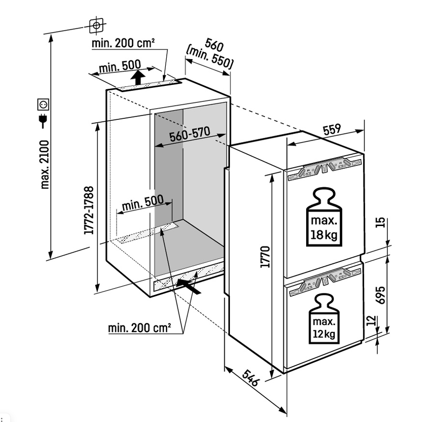 Описаниехолодильник-морозильник встраиваемый, 262 л, класс энергопотребления А+, ручная система размораживания, 55,9х54,6х177 см