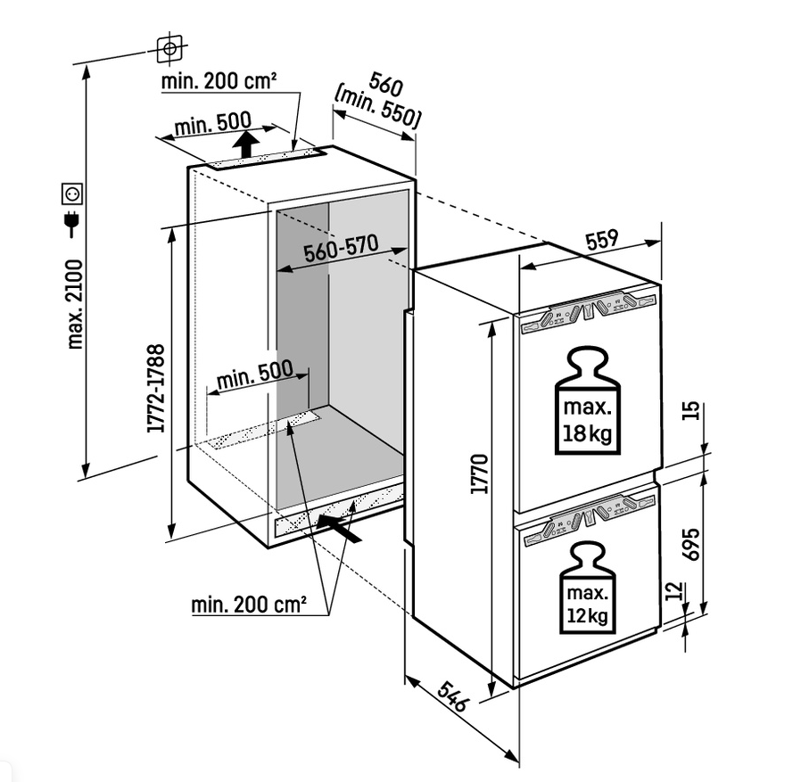 Описаниехолодильник-морозильник встраиваемый, 251 л, класс энергопотребления А+, No Frost, 55,9х54,6х177 см