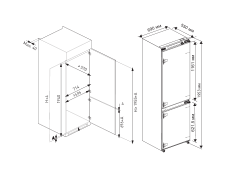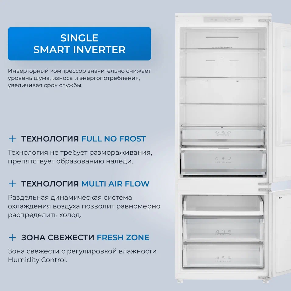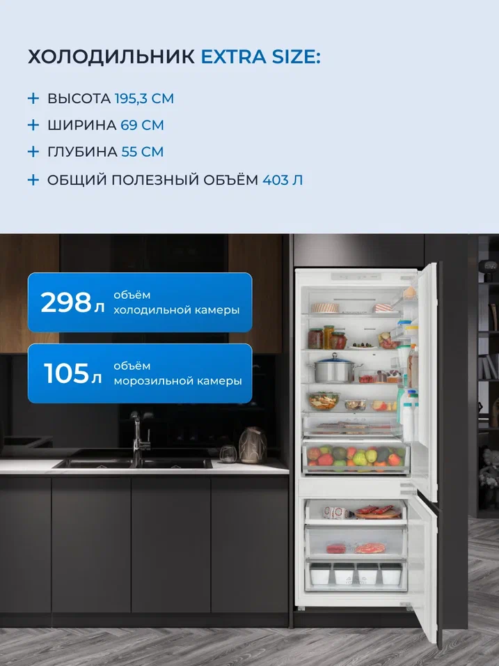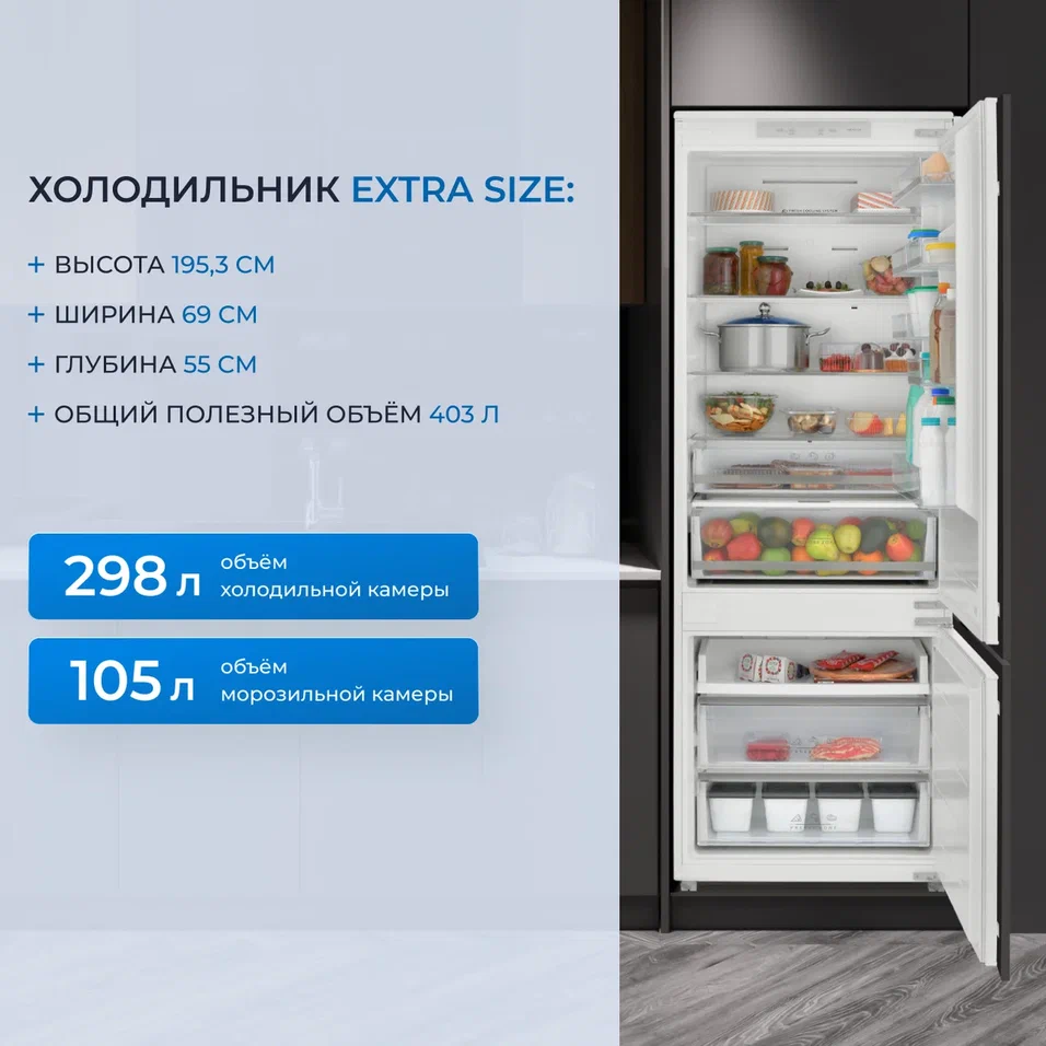 Описаниехолодильник-морозильник встраиваемый, 403 л, класс энергопотребления А+++, No Frost, 69х55х195,3 см