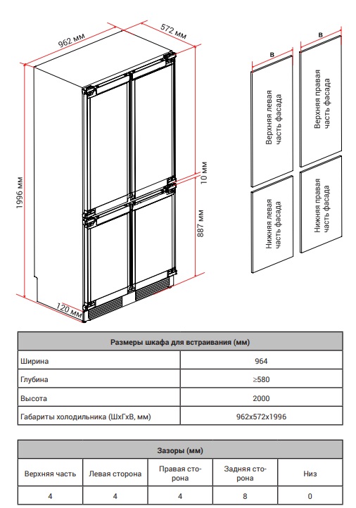 Возможность перевешивания двери нет Количество дверей 4 Количество камер 3 Мощность замораживания до 10 кг/cутки Общий объем 526 л Объем морозильной камеры 175 л Размер (Высота) 199,6 см Размер (Глубина) 57,2 см Размер (Ширина) 96,2 см Размораживание морозильной камеры No Frost Тип установки встраиваемый Класс энергопотребления класс A+++ Ширина прибора 91 - 121 см Высота прибора 196 - 200 см Управление сенсорное Гарантийный срок (месяцы) 24 Страна производитель Китай Ссылка на сайт производителя https://hiberg.ru/catalog/kholodilniki_i_morozilnye_kamery/vstraivaemye_kholodilniki_i_morozilniki/vstraivaemyy_kholodilnik_hiberg_s_rfq_800_b_inverte Максимальный уровень шума 37 дБ Тип холодильник с морозильником Внутреннее освещение есть Зона свежести есть Объем холодильной камеры 351 л Размораживание холодильной камеры No Frost Расположение морозильной камеры снизу Вес прибора 147 кг Тип компрессора инверторный Количество контейнеров в морозильной камере 6 Размер (Ширина), см 96,2 Размер (Высота), см (Общие) 199,6 Размер (Глубина), см 57,2 - Отзывы