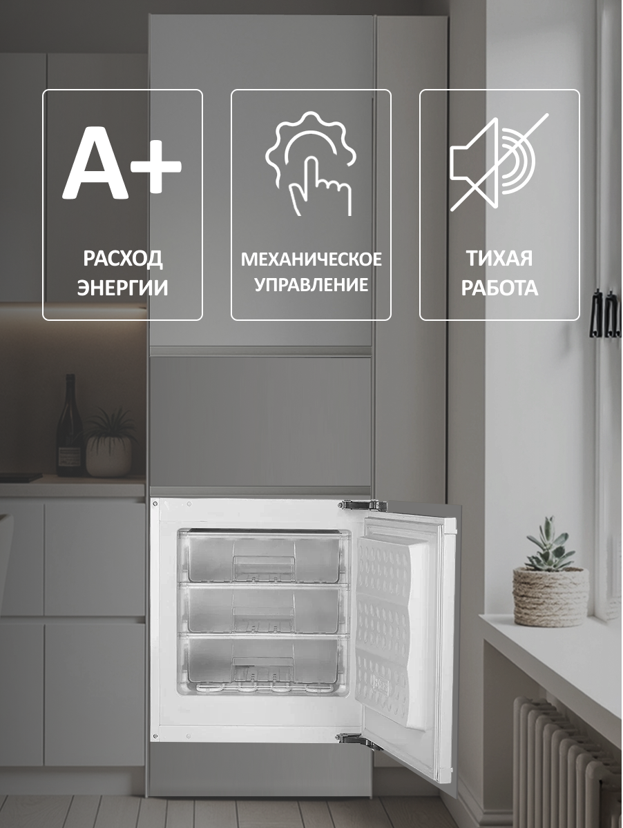 Описаниеморозильник встраиваемый, 90 л, класс энергопотребления A+, ручная система размораживания, 59,5х54,5х81,8 см