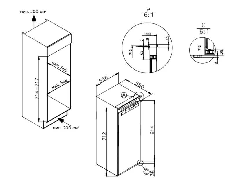 Описаниеморозильник встраиваемый, 62 л, класс энергопотребления А++, No Frost, 55,6х55х71,2 см