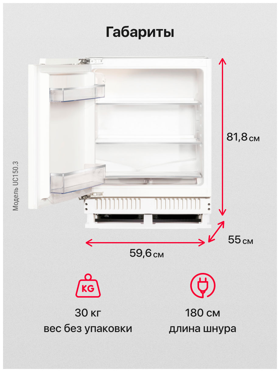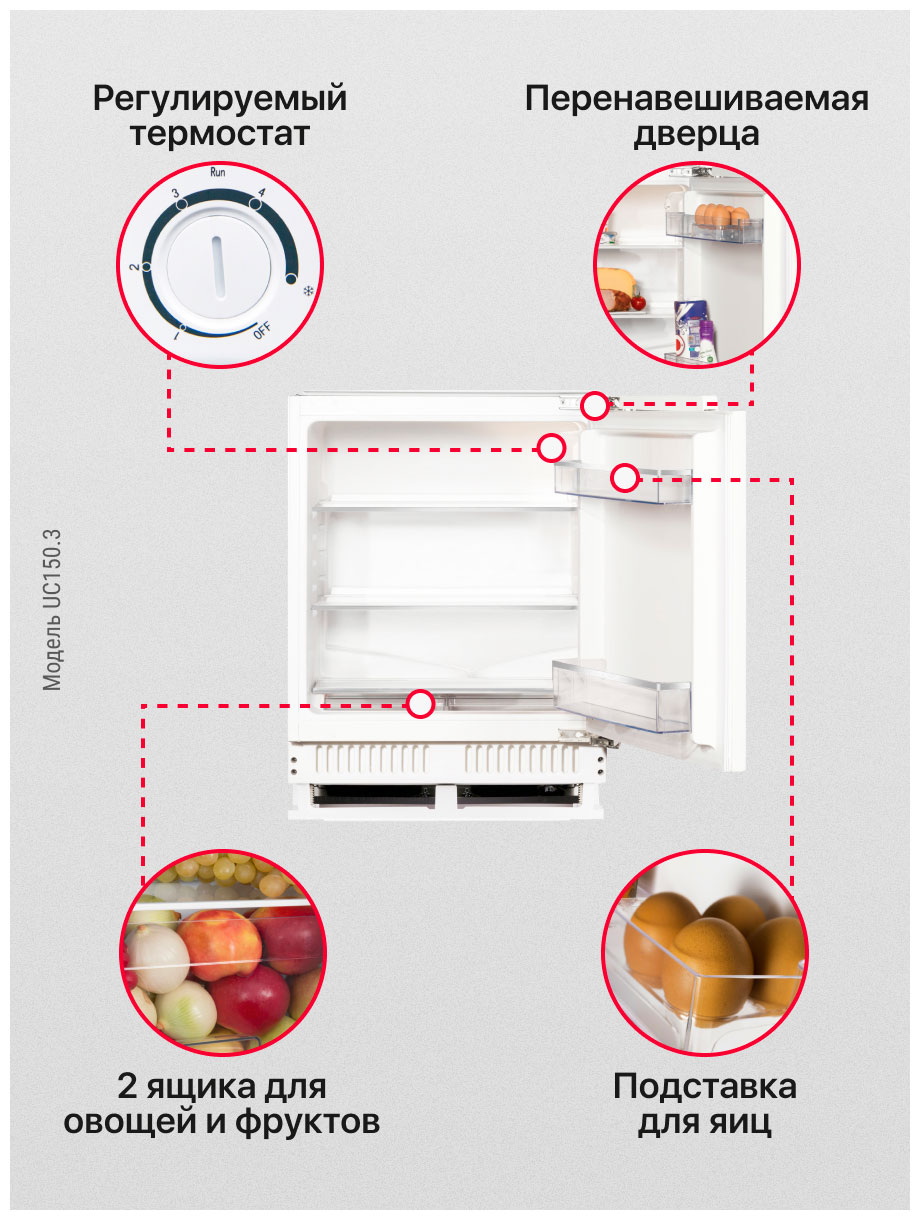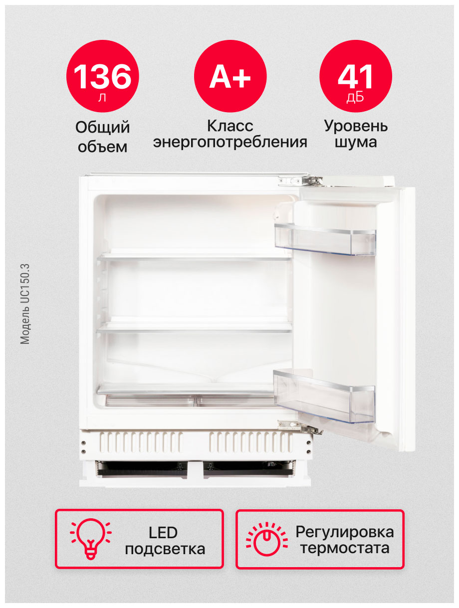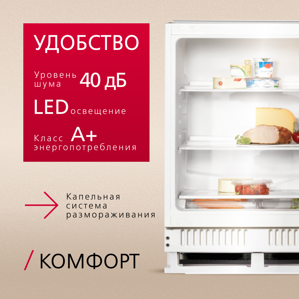 Описаниехолодильник однокамерный встраиваемый, 135 л, класс энергопотребления А+, капельная система размораживания, 59,6х55х81,8, белый