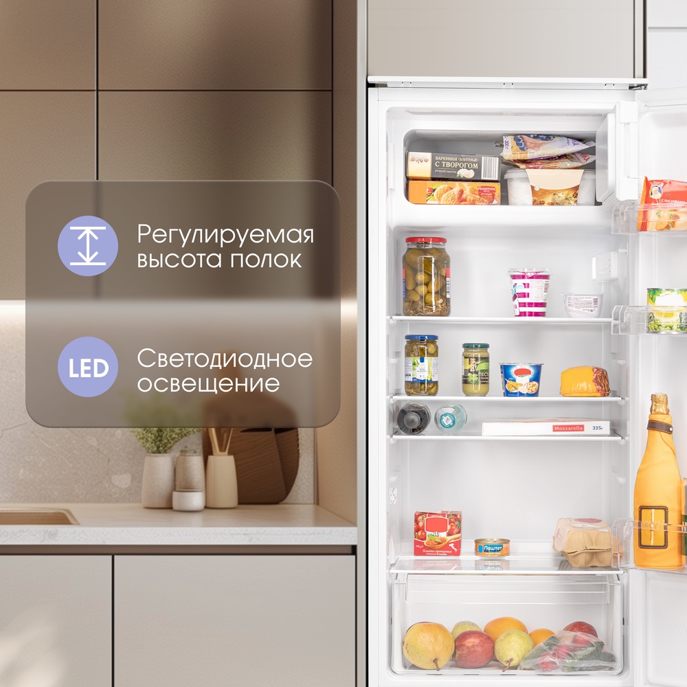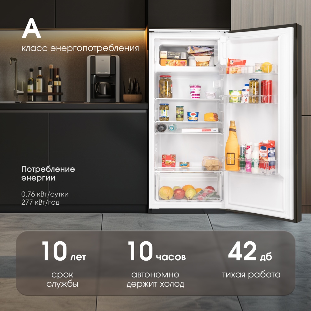 Описаниехолодильник однокамерный встраиваемый, 186 л, класс энергопотребления А, капельная система размораживания, 54х54х122 см