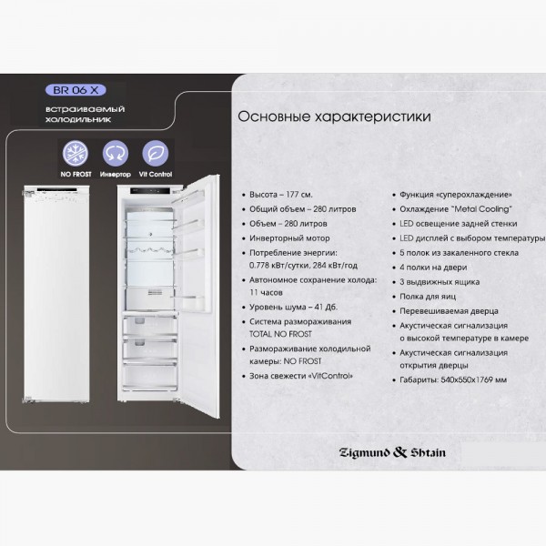 Возможность перевешивания двери есть Количество дверей 1 Количество камер 1 Общий объем 280 л Объем морозильной камеры нет Размер (Высота) 176,9 см Размер (Глубина) 55 см Размер (Ширина) 54 см Размораживание морозильной камеры нет Тип установки встраиваемый Класс энергопотребления класс A+ Ширина прибора 51 - 60 см Высота прибора 176 - 180 см Управление электронное Гарантийный срок (месяцы) 24 Страна производитель Китай Ссылка на сайт производителя https://www.zigmundshtain.ru/appliances/refrigerator/holodilnik-zigmund-shtain-br-06-x Максимальный уровень шума 41 дБ Тип холодильник без морозильника Внутреннее освещение есть Зона свежести есть Объем холодильной камеры 280 л Размораживание холодильной камеры No Frost Расположение морозильной камеры нет Размер в упаковке (Высота) 184 см Размер в упаковке (Ширина) 57,3 см Размер в упаковке (Глубина) 57,3 см Вес прибора 57,5 кг Размер (Ширина), см 54 Размер (Высота), см (Общие) 176,9 Размер (Глубина), см 55 - Отзывы