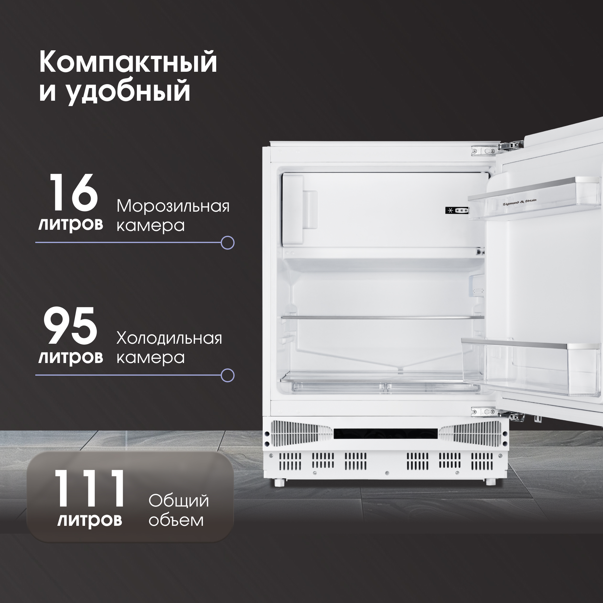 Описаниехолодильник однокамерный встраиваемый, 111 л, класс энергопотребления А+, ручная система размораживания, 59,6х55х81,8 см