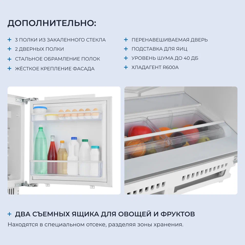 Описаниехолодильник однокамерный встраиваемый, 135 л, класс энергопотребления А+, капельная система размораживания, 59,6х55х81,8 см