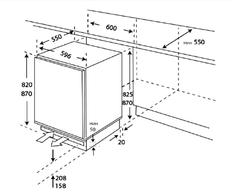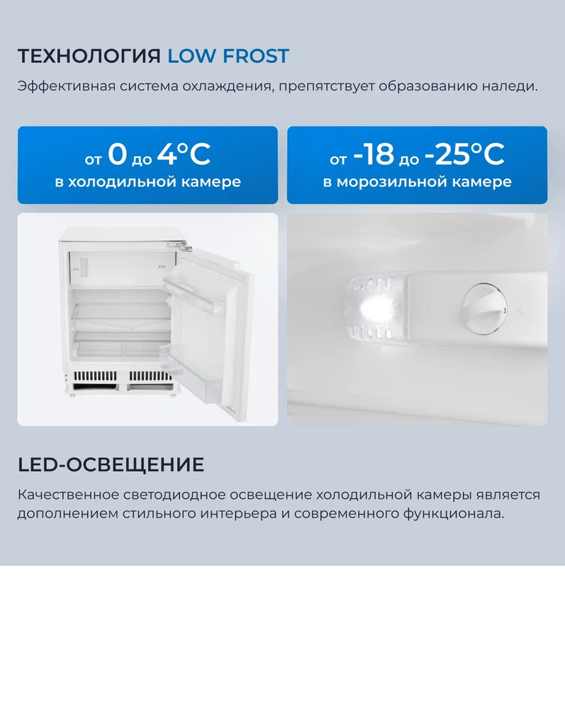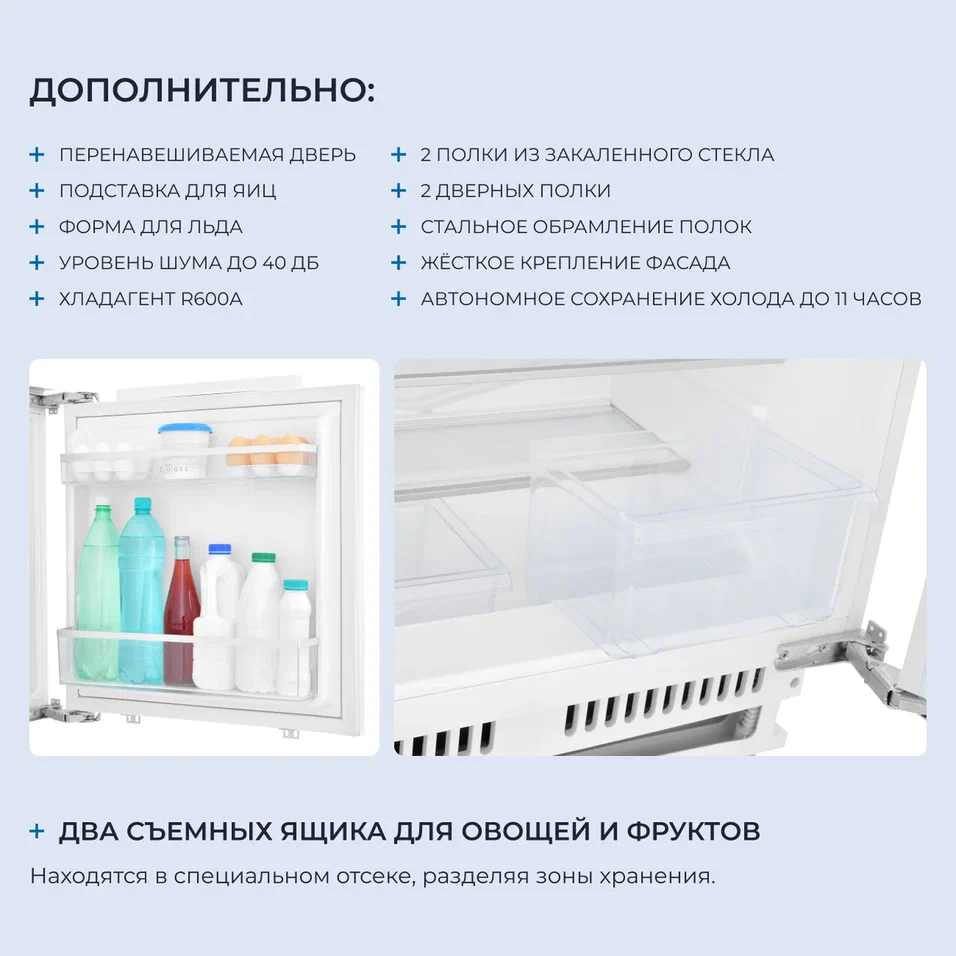 Описаниехолодильник однокамерный встраиваемый, 111 л, класс энергопотребления А+, капельная система размораживания, 59,6х55х81,8 см