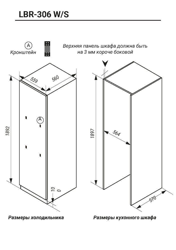 Описаниехолодильник однокамерный встраиваемый, 306 л, класс энергопотребления A+, No Frost, 55,9х55,3х189 см, белый