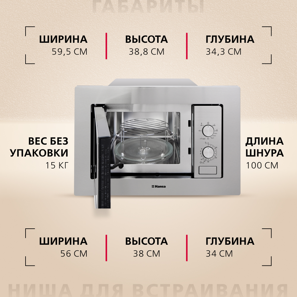 Размер (Высота) 38,8 см Размер (Глубина) 34,3 см Размер (Ширина) 59,5 см Тип установки встраиваемый Цвет нержавеющая сталь Ширина прибора 60 см Высота прибора 38 см Дисплей нет Конвекция нет Переключатели поворотные Управление механическое Гарантийный срок (месяцы) 12 Страна производитель Китай Ссылка на сайт производителя https://hansa.ru/product/vstraivaemaya-mikrovolnovaya-pech-hansa-amm20bmxh-nerzhaveyushchaya-stal Количество программ 8 Внутреннее покрытие камеры нержавеющая сталь Внутренний объем 20 л Гриль есть Дверца навесная, петли слева Мощность микроволн 800 Вт Открывание дверцы кнопка Поворотный стол есть Размер в упаковке (Высота) 44,6 см Размер в упаковке (Ширина) 65 см Размер в упаковке (Глубина) 40,5 см Вес прибора 15 кг Размер (Ширина), см 59,5 Размер (Высота), см (Общие) 38,8 Размер (Глубина), см 34,3 - Отзывы