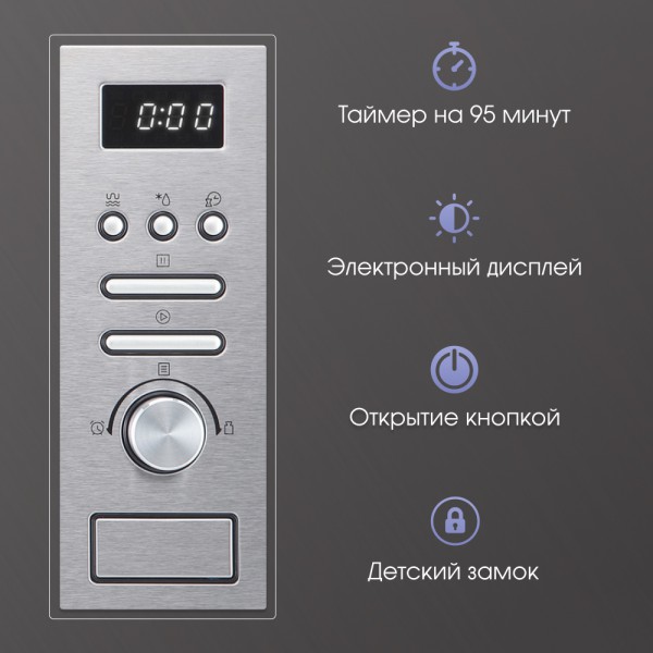 Описаниемикроволновая печь встраиваемая, 20 л, 59,5х34,4х38,8 cм, нержавеющая сталь