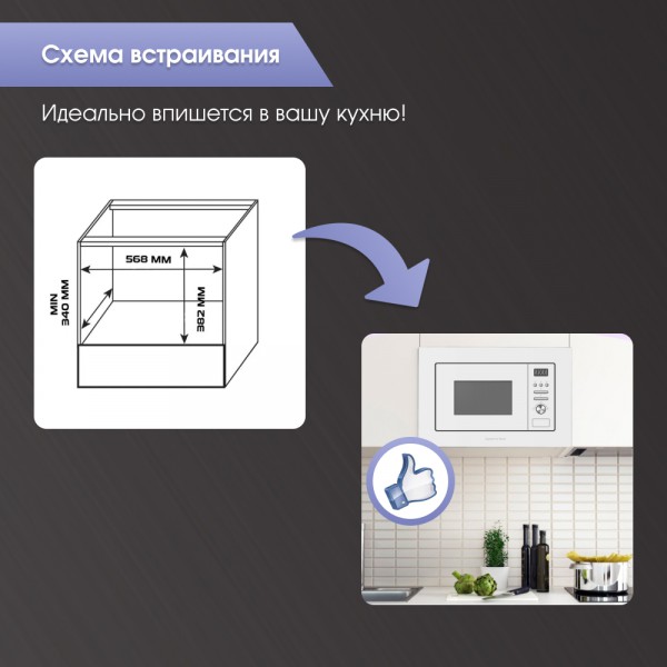 Описаниемикроволновая печь встраиваемая, 20 л, 59,5х34,4х38,8 cм, белый