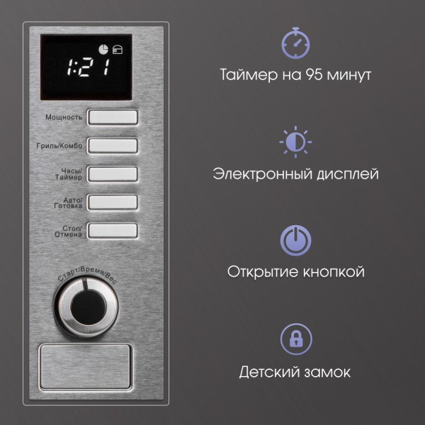 Описаниемикроволновая печь встраиваемая, 20 л, 59.5х32,9х38,2 см, нержавеющая сталь
