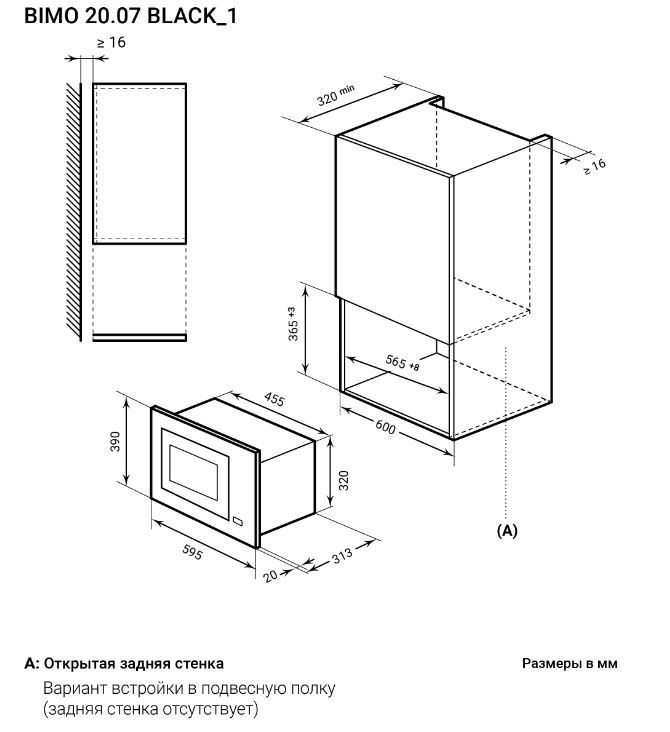 Описаниемикроволновая печь встраиваемая, 20 л, 59,5х31,3х39 см, черный