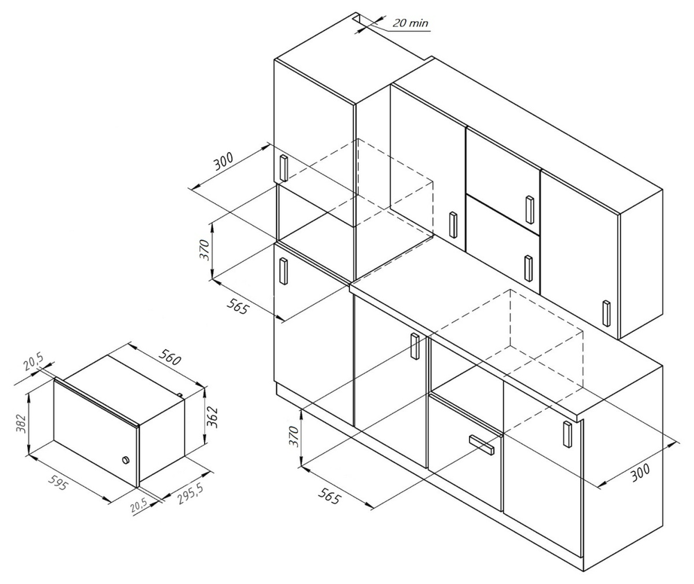 Описаниемикроволновая печь встраиваемая, 20 л, 59,5х39х38 см, черный