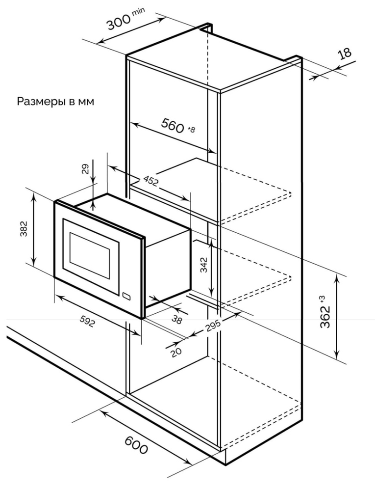 Описаниемикроволновая печь встраиваемая, 20 л, 59,5х31,5х38,2 см, черный