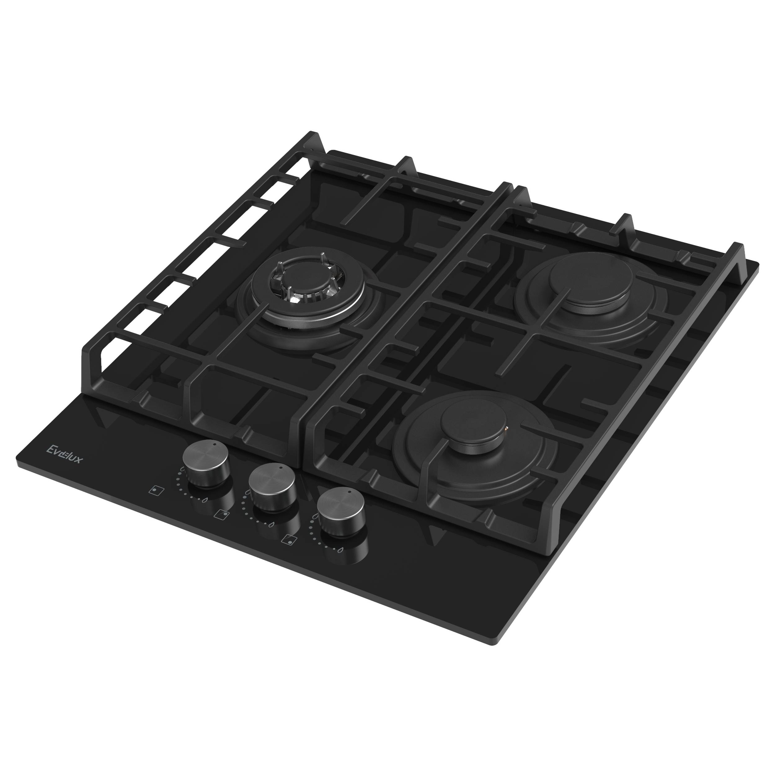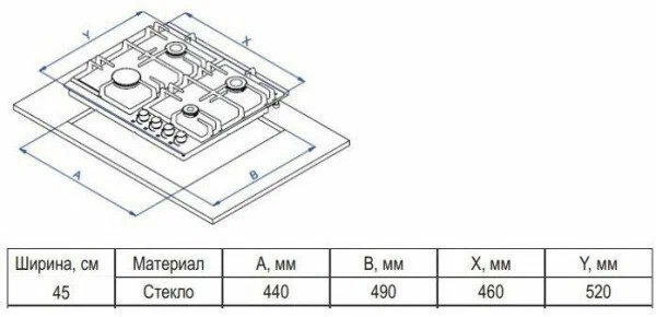 Описаниеповерхность газовая независимая, 45 см, газ на стекле, 3 конфорки, решетки чугунные, черный