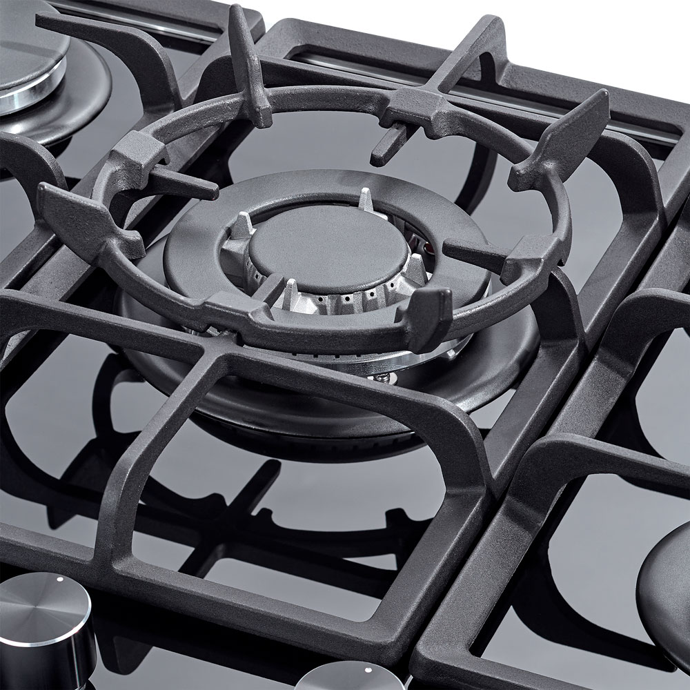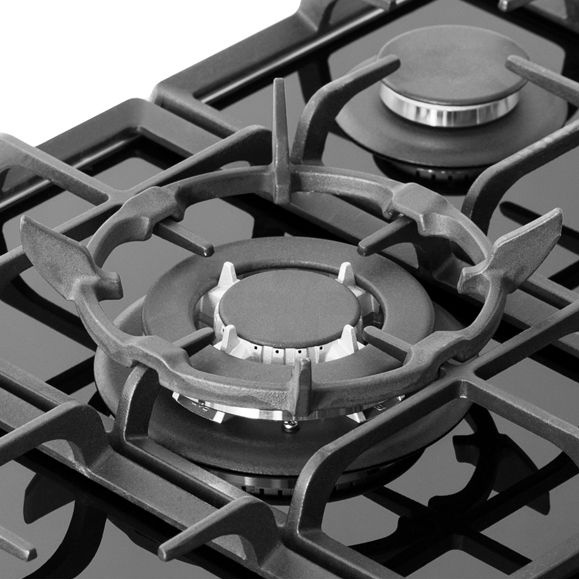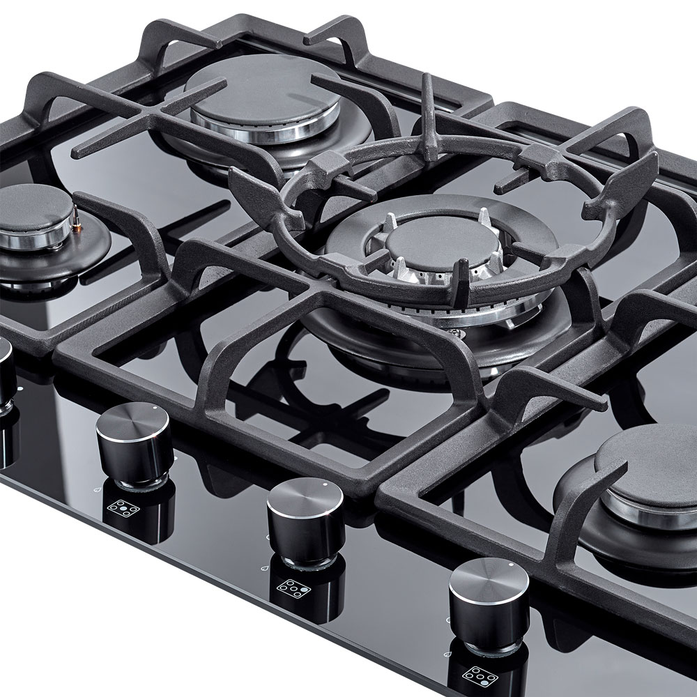 Описаниеповерхность газовая независимая, 70 см, газ на стекле, 5 конфорок, решетки чугунные, черный