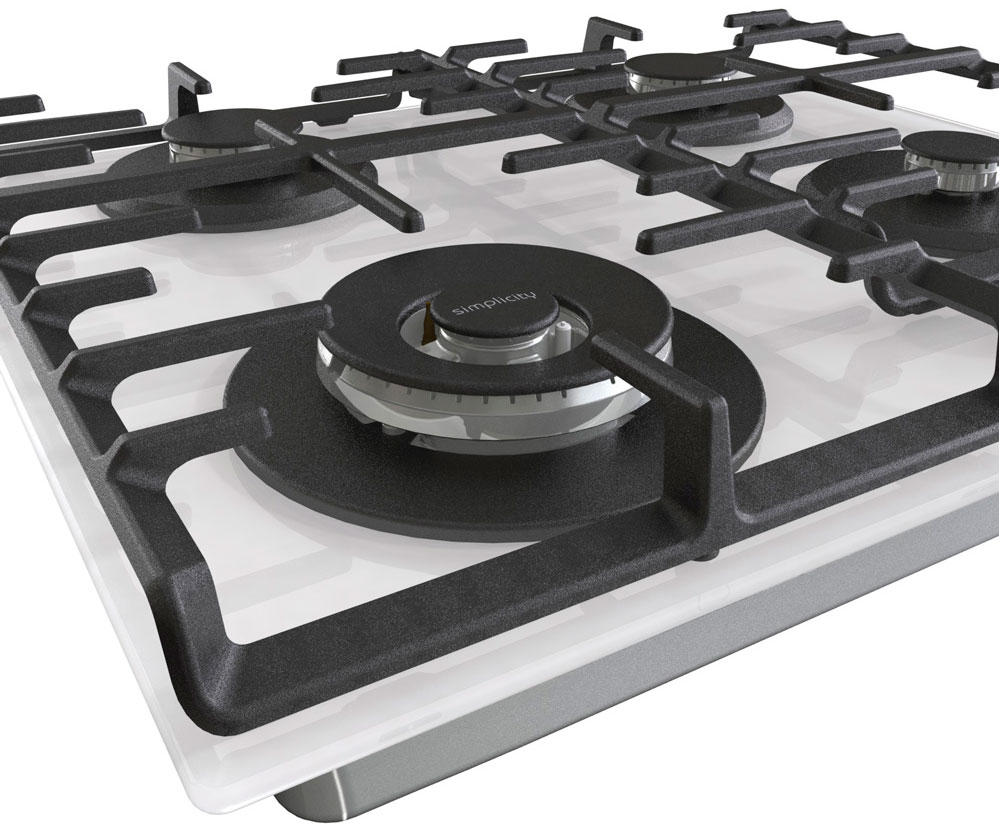 Описаниеповерхность газовая независимая, 60 см, газ на стекле. 4 конфорки, решетки чугунные, белый