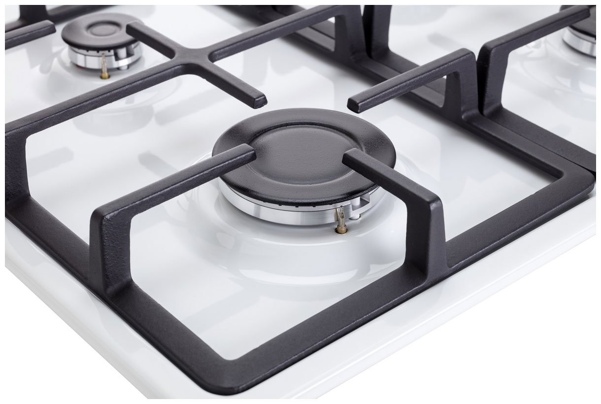 Описаниеповерхность газовая независимая, 60 см, газ на эмали, 4 конфорки, решетки чугунные, белый