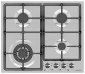 Описаниеповерхность газовая независимая, 60 см, газ на металле, 4 конфорки, решетки чугунные, нержавеющая сталь